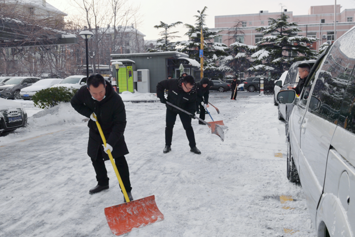 刚到单位的干部职工,纷纷拿起扫帚、铁锹,加入到扫雪除冰大“会战”的队伍中。大家齐心协力、现场一片热火朝天,干净整洁的道路很快清扫出来,保证了干部职工出行安全。